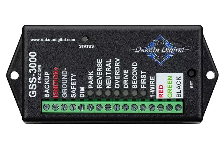 The GSS-3000 is a new generation of gear-shift position system from Dakota Digital. Able to be used with a Dakota Digital instrument system or on its own, this versatile unit can relay transmission gear position to a VFD, VHX, HDX or RTX instrument system, as well as the DGS-series of standalone indicators.